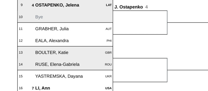 Šodien izlozē noskaidrojās, ka ar ceturto numuru izliktā un no pirmās kārtas atbrīvotā Aļona Ostapenko (šobrīd #23) vispirms spēlēs pret filipīnieti Aleksandru Ealu (jaunākajā rangā būs #46) vai austrieti Jūliju Grāberi (patlaban #87). Ja izdosies iekļūt trešajā kārtā, tad tur pretī varētu stāsies ukrainiete Dajana Jastremska (#49) vai kāda cita.