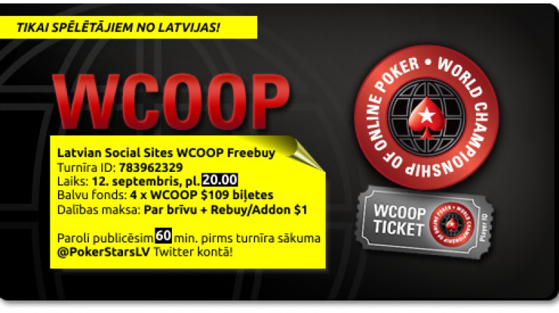Vakardien, 8. septembrī, sākās Pasaules Pokera Online Čempionāts (WCOOP 2013), kurā kopumā norisināsies 66 turnīri ar garantēto balvu fondu $40 miljonu apmērā! Par godu šim notikumam Pokerstars 12. septembrī, pl. 20.00 aicina visus spēlētājus no Latvijas uz īpašo TIKAI Latvijas spēlētājiem paredzēto Freebuy WCOOP turnīru, kurā spēlētāji varēs iegūt garantēti 4 biļetes uz WCOOP-19 turnīru, kura dalības maksa ir $109!