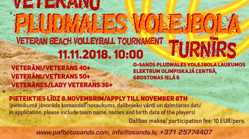 11.novembrī no plkst.10.00 “O-Sands” laukumos Elektrum Olimpiskajā centrā (Grostonas iela 6b) norisināsies ikgadējais Veterānu turnīrs pludmales volejbolā. Ik gadu šis notikums pulcē plašu apmeklētāju pulku.