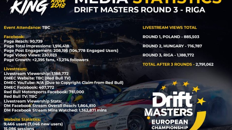 4.augustā Rīgā tika aizvadīts lielākā Eiropas drifta seriāla Drift Masters European Championship (DMEC) posms „Betsafe Drift King of Riga”. Tajās triumfēja Īrijas pārstāvis Džeimss Dīns (James Dean), uzvarot gan kvalifikācijā, gan tandēmu cīņu finālā.