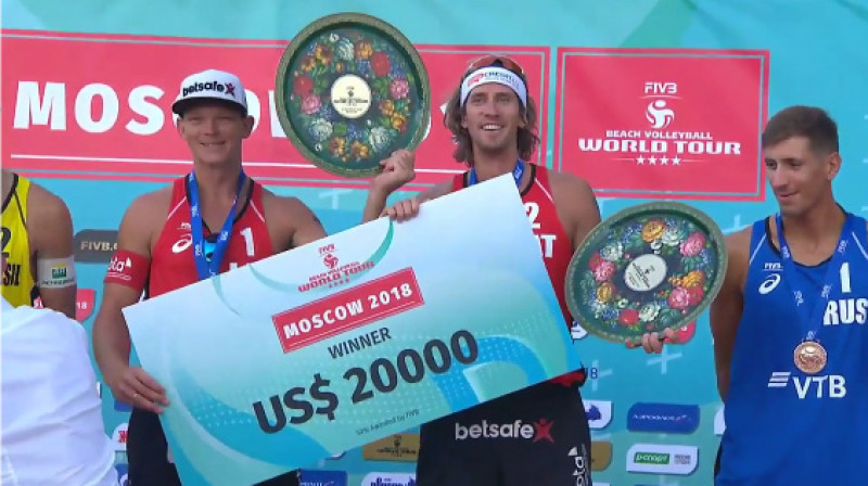 Latvijas vadošais pludmales volejbola duets Aleksandrs Samoilovs un Jānis Šmēdiņš svētdien triumfēja pasaules tūres četru zvaigžņu posmā, kas risinājās Krievijas galvaspilsētā Maskavā.Video: FIVB Volleyball