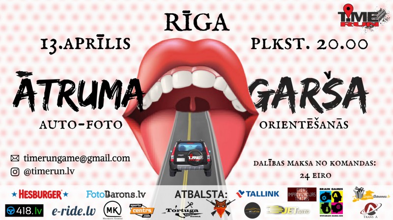 Piektdien, 13.aprīlī, plkst. 20.00 notiks “Time Run” auto-foto orientēšanās otrās sezonas otrais posms “Ātruma garša”. Dalībnieki tiek aicināti pulcēties restorānā "Hesburger", Krasta ielā 85. Posma izskaņā gaidāma dalībnieku apbalvošanas ceremonija.