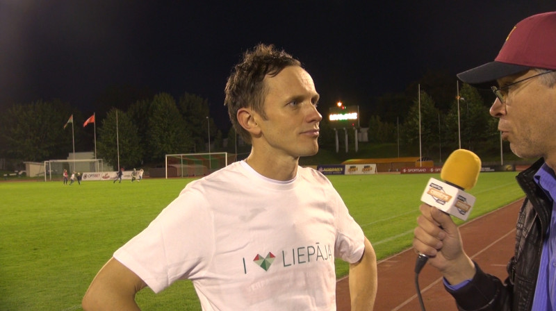 Pēcspēles intervijas pēc labdarības futbola spēles Liepājā.