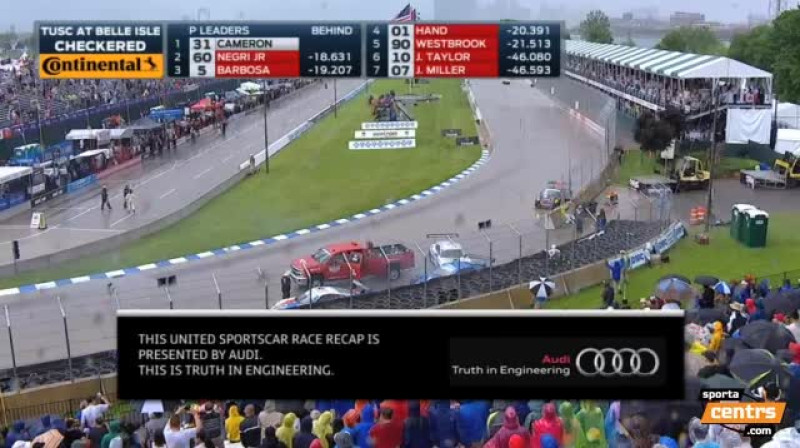 Autosacīkšu seriāla "United SportsCar Championship" (USCC) sacensībās Detroitā sportistus pārsteidza īpaši slapja un slidena trase, kas izraisīja kādu savdabīgu avāriju. Viens no dalībniekiem nespēja savaldīt savu "Aston Martin" un ietriecās pikapā, kas bija izbraucis uz pirms tam notikušas avārijas vietu. Šajā līkumā nespēja nobremzēt arī citi sportisti. Video avots: https://www.youtube.com/watch?v=S3u...