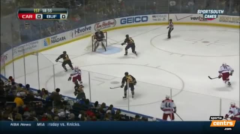 Nacionālās hokeja līgas pirmajā spēlē Bufalo „Sabres” ar divu aizsarga Kristiana Ērhofa vārtu guvumu un divu vārtsarga Raiena Millera rezultatīvo piespēļu palīdzību ar 3:2 pieveica Karolīnas „Hurricanes”. Latvijas jaunais uzbrucējs Zemgus Girgensons spēles sākumā guva traumu, taču otrajā periodā atgriezās laukumā, noslēdzot maču ar lietderības koeficentu +1.
