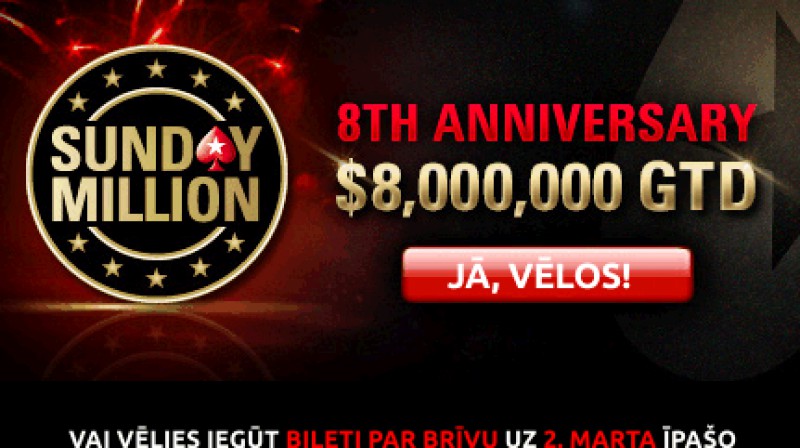 IELŪGUMS: Sunday Million $8M GTD Freebuy tikai LATVIJAS spēlētājiem - 1. marts, pl. 20.00!