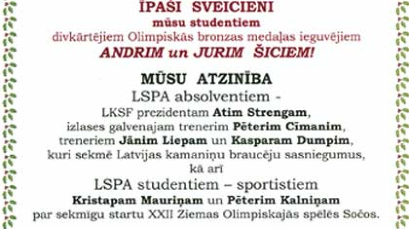 14.februārī Latvijas Sporta pedagoģijas akadēmijas rektors profesors Jānis Žīdens Akadēmijas studentu, docētāju un darbinieku vārdā nosūtījis apsveikumu Latvijas olimpiskajai kamaniņu sporta komandai, informē augstskolas preses dienests.