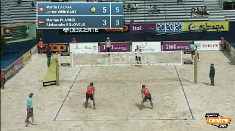 Šodien Šveices pilsētā Gštādē notiekošajā "Grand Slam" pludmales volejbola turnīrā Q grupas pēdējā spēlē Latvijas pludmales volejbola pāris Mārtiņš Pļaviņš un Aleksandrs Solovejs tika pie panākuma. Grupā gan mūsējie, neskatoties uz to, ieņēma pēdējo vietu.