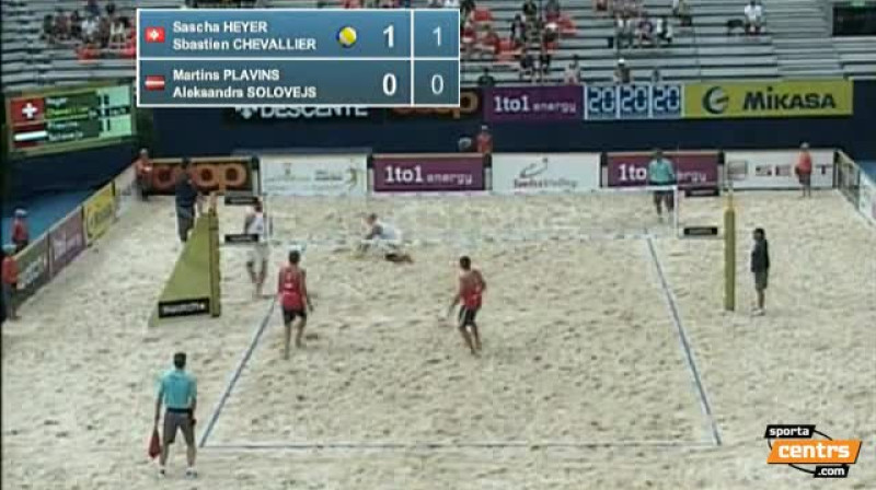 Šveices pilsētā Gštādē notiekošā ''Grand Slam'' turnīra Q apakšgrupas otrajā spēlē Mārtiņš Pļaviņš un Aleksandrs Solovejs divu setu cīņā (19:21; 16:21) atzina Sebastiana Ševeljē un Sašas Heijera pārākumu.