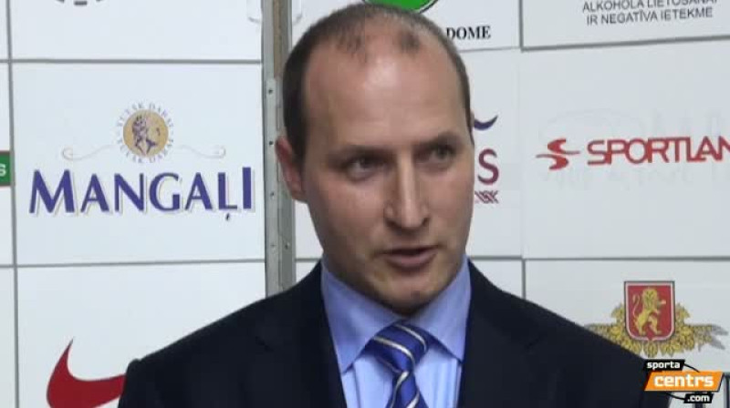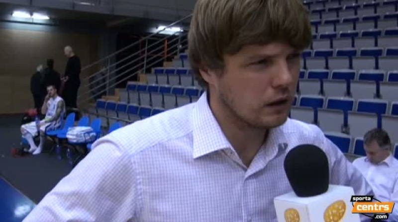 Pēcspēles komentāri pēc Liepājas Lauvu uzvaras pār University of Tartu Baltijas Basketbola līgā, 2011. gada 2. novembrī Liepājā.