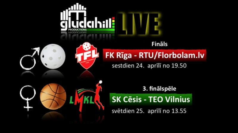 Interneta vietne Gludahill.com šīs nedēļas nogalē piedāvā divu finālspēļu tiešraides. Šodien, 24. aprīlī, sporta līdzjutējiem būs iespēja vērot Triobet Florbola līgas finālspēli starp "RTU/Florbolam.lv" un FK "Rīga", bet rīt, 25. aprīlī, jūsu uzmanībai piedāvās Lietuvas Sieviešu basketbola līgas trešo finālspēli starp SK "Cēsis" un "Teo Basket Vilnius".