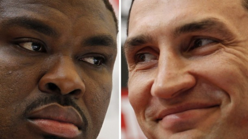 Pasaules čempions boksā IBO, IBF un WBO versijās smagajā svarā, ukrainis Vladimirs Kļičko un IBF titula pretendents, bijušais WBC čempions, nigērietis Semjuels Pīters pirmdien satikās preses konferencē Frankfurtē, kur 11. septembrī notiks abu bokseru cīņa. Foto: AP/AFP/Scanpix un boxingscene.com