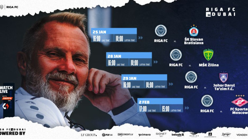 Trīskārtējās Latvijas čempiones "Riga Football Club" nākamās spēles no treniņnometes Apvienotajos Arābu Emirātos tiešraidē varēsiet skatīties portālā Sportacentrs.com un TV4 kanālā.