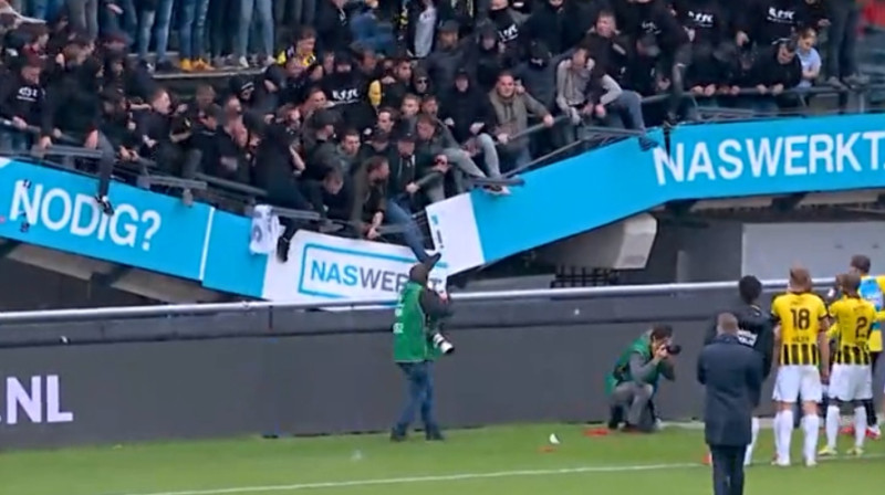 Nīderlandes futbola spēcīgākajā līgā Ārnemas "Vitesse" svētdien viesos pārspēja Nijmegenas NEC - 1:0. Uzvarētāji devās nosvinēt kopā ar līdzjutējiem, taču sabruka tribīne. Laimīgā kārtā iztika bez savainojumiem. Video: ESPN / telegraaf.nl
