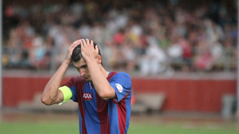 Šodien LMT Virslīgas pirmajā 16. kārtas mačā mājinieki FK "Jūrmala-VV" nespēja noturēt divu vārtu pārsvaru pret "Olimps/RFS" futbolistiem, spēli beidzot ar neizšķirtu rezultātu 2:2.Foto: Romualds Vambuts, Sportacentrs.com