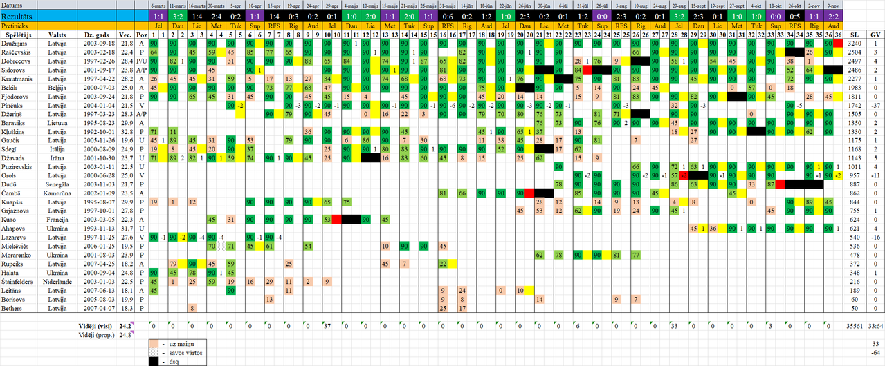 | 2025. | 36 | 32 | 0.89 | 31 | 24.0 | 4.1 | Družiņins; Raščevskis; Dobrecovs | 6 | 2.97 | 377 |