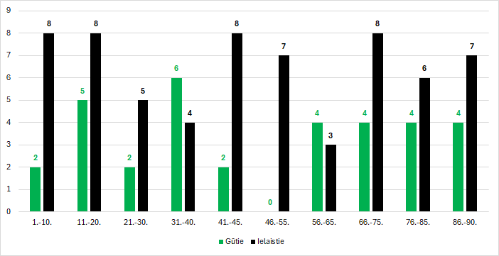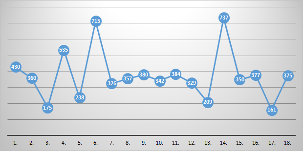 | 1. | 2. | 3. | 4. | 5. | 6. | 7. | 8. | 9. | 10. | 11. | 12. | 13. | 14. | 15. | 16. | 17. | 18. | Vidēji | Vieta | Mediāna | Mediānas vieta |