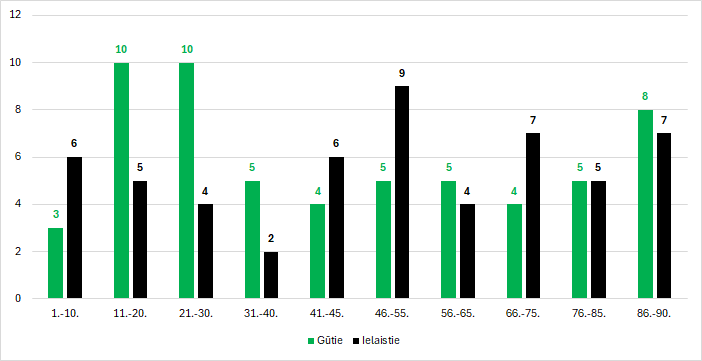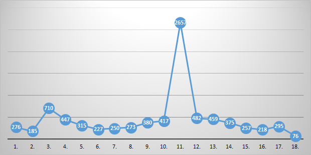 | 1. | 2. | 3. | 4. | 5. | 6. | 7. | 8. | 9. | 10. | 11. | 12. | 13. | 14. | 15. | 16. | 17. | 18. | Vidēji | Vieta | Mediāna | Mediānas vieta |