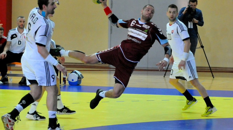 Pirmo uzvaru 2014. gada Eiropas čempionāta kvalifikācijas spēlē izcīnīja Latvijas vīriešu handbola izlase, kad Dobelē ar 28:24 (14:9) pieveica spēcīgo Slovākijas valstsvienību.Foto: Romualds Vambuts