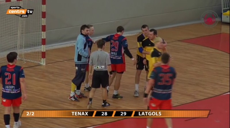 Aizraujošā un spraigā Latvijas Virslīgas čempionātu līderu duelī šodien Dobelē tika fiksēts neizšķirts. Dobeles "Tenax" dažas sekundes pirms mača beigām izrāva neizšķirtu pret "SK Latgols" - 29:29. Kādā epizodē abu komandu spēlētāji arī paspēja izkauties. Uzmanības centrā Gints Grandbergs (''Tenax'') un Sergejs Tretjakovs (''Latgols'').
