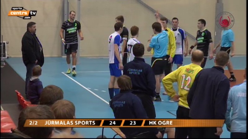 Sestdien Latvijas handbola virslīgas čempionātā vīriešiem uzvaru saspringtā spēlē izcīnīja ''Jūrmalas Sports'', kas savā laukumā ar 26:25 pārspēja ''Ogres'' vienību. Uzvarētājiem astoņus vārtus guva Edvīns Latkovskis, bet ''Ogres'' labā ar desmit vārtu guvumiem rezultatīvākais spēlētājs bija Arvis Laganovskis.