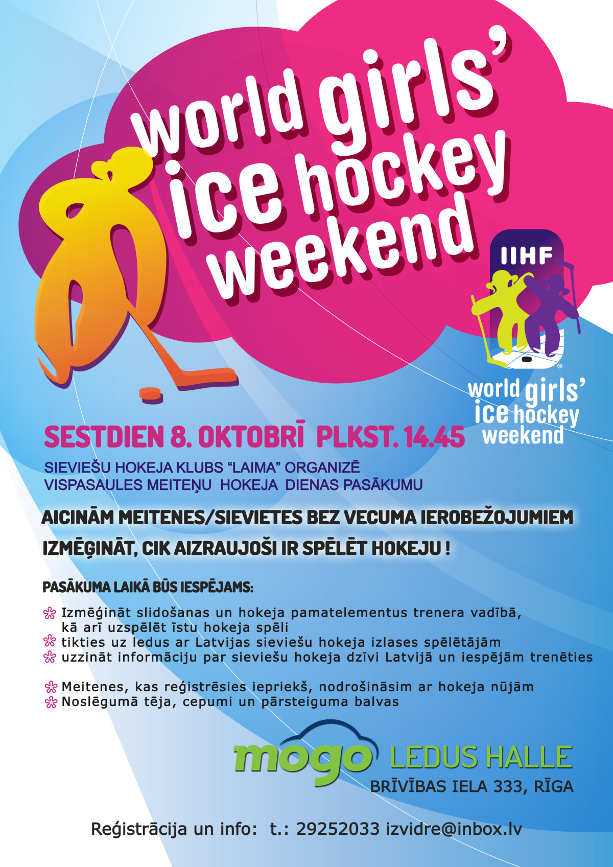 Sestdien, 8. oktobrī plkst. 14.45 “Mogo” ledus hallē Rīgā, Brīvības ielā 333 sieviešu hokeja klubs “Laima” organizē IIHF Vispasaules meiteņu hokeja dienas pasākumu.