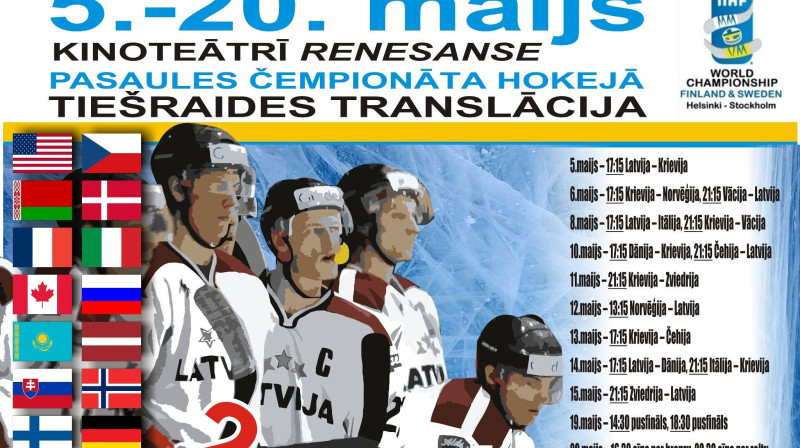 No 4. līdz 20. maijam Zviedrijā un Somijā norisināsies pasaules hokeja čempionāta spēles. Arī šogad pasaules elitē būs Latvijas izlase, kurai būs nepieciešams skatītāju atbalsts. Daugavpilī hokeja cienītāji tiek aicināti masveidā pulcēties kinoteātrī "Renesanse". Tur spēles varēs vērot lielajā ekrānā.