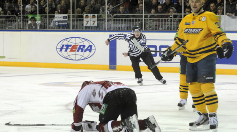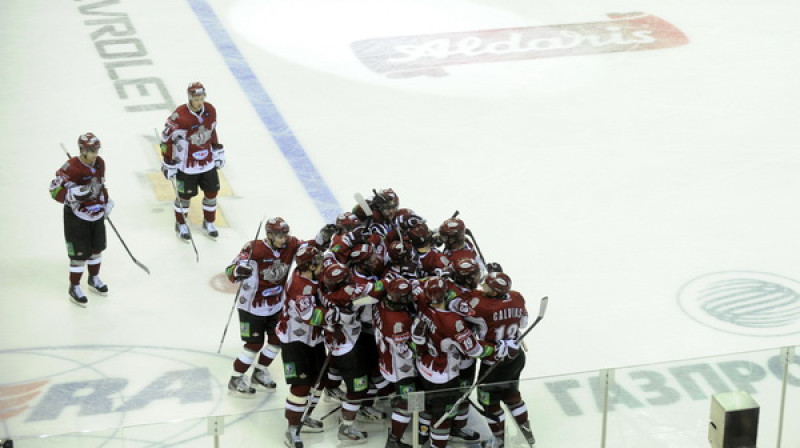 Pirmo uzvaru 2012. gadā izcīnīja Rīgas "Dinamo", kas Kontinentālās hokeja līgas regulārās sezonas spēlē ar 1:0 pieveica Oļega Znaroka un Harija Vītoliņa trenēto Maskavas "Dynamo". Foto: Romāns Kokšarovs, Sporta Avīze/F64.