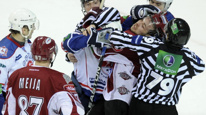 Kontinentālās hokeja līgas (KHL) spēlē svētdien Rīgas "Dinamo" ar 2:0 pieveica līgas kausligāko komandu Čehovas "Vitjazj", kas kārtējo reizi izcēlās ar savu nesavaldību. Foto: Romāns Kokšarovs, Sporta Avīze/F64 Photo Agency.