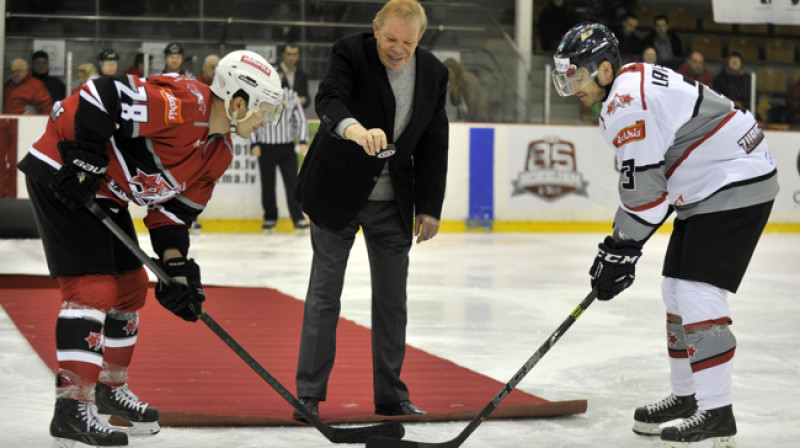 Latvijas hokeja čempionāta Zvaigžņu spēle starp pazīstamo hokejistu Oļega Sorokina un Rodrigo Laviņa komandam. Spēlē noslēdzas ar rezultātu 7:7. Par labākajiem spēlētājiem tika atzīts Viktors Lobačovs un Toms Bluks. Foto: Romāns Kokšarovs, F64 Photo Agency.