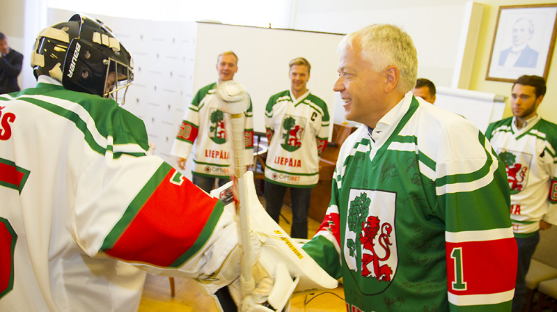 Klātesot pilsētas domes priekšsēdētājam Uldim Seskam un sporta nozares vadībai, medijiem šodien tika prezentēts hokeja klubs "Liepāja". Atnākušajiem bija iespēja apskatīt jaunās hokejistu formas, redzēt kluba mājas lapu un iepazīties ar kluba mērķiem. Savukārt "saldajā ēdienā" tika atskaņota Liepājas rokgrupas "Willow Farm" radītā kluba himna, kas turpmāk aicinās liepājniekus uz mājas arēnas ledus pirms katras spēles.Foto: Aigars Prūsis