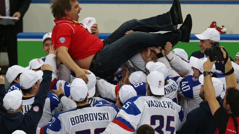Oļega Znaroka un Harija Vītoliņa trenētā Krievijas hokeja izlase svētdien Minskā izcīnīja pasaules čempionu titulu hokejā. Piedāvājam svinību foto galeriju.Foto: fhr.ru, AP, AFP, ITAR-TASS / Scanpix