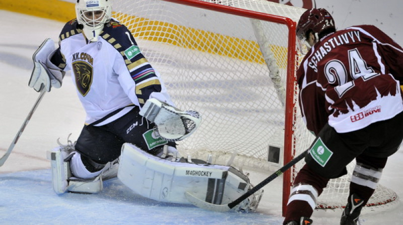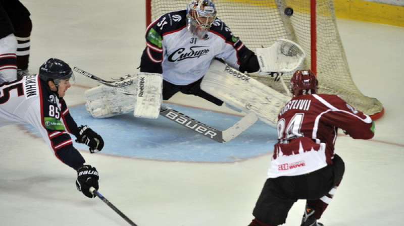 Kontinentālās hokeja līgas (KHL) klubs Rīgas "Dinamo" šodien izcīnīja pirmo uzvaru pirmssezonas pārbaudes spēlēs. Divus vārtus gūstot pieredzējušajam Pjotram Sčastļivijam, rīdzinieki ar 4:1 uzvarēja Novosibirskas "Sibir". Foto: Romāns Kokšarovs, f64