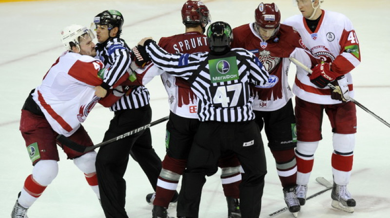 Kontinentālās hokeja līgas (KHL) spēlē svētdien Rīgas "Dinamo" ar 2:0 pieveica līgas kausligāko komandu Čehovas "Vitjazj", kas kārtējo reizi izcēlās ar savu nesavaldību. Foto: Romāns Kokšarovs, Sporta Avīze/F64 Photo Agency.