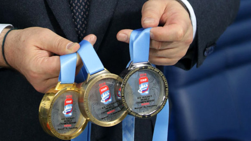 2016. gada hokeja pasaules čempionāta organizatori šodien prezentēja medaļas. Kā zināms, planētas meistarsacīkstes 6.-22. maijā notiks Krievijas lielākajās pilsētās Maskavā un Sanktpēterburgā.Foto: fhr.ru, TASS / Scanpix