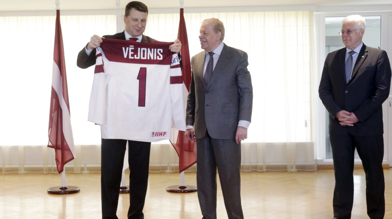 Latvijas Valsts prezidents Raimonds Vējonis šodien tikās ar nacionālo hokeja izlasi pirms došanās uz pasaules čempionātu. "Jums šajā čempionāta gaidāmas spraigas spēles. Tomēr esmu pārliecināts par jūsu spējām un sagatavotību godam aizstāvēt Latvijas vārdu, sporta līdzjutējus priecējot ar lieliskiem vārtiem un pašaizliedzīgu spēli,” sacīja prezidents un atzīmēja, ka jau 20 gadu garumā hokeja čempionāts ir viens no gaidītajiem pavasara notikumiem, kam seko līdzi ne tikai rūdīti sporta līdzjutēji, bet arī iedzīvotāji, kuri ar sportu ikdienā ir uz "jūs", tas ir notikums, ko pārrunā ģimenes, draugu un darba kolēģu lokā.Raimonds Vējonis apliecināja, ka kopā ar Latvijas līdzjutējiem sekos līdzi izlases sniegumam. "Novēlu jums mērķtiecību, veiksmi un saliedētu komandas spēli! Lai jums izdodas!” Latvijas hokeja izlase tikšanās laikā dāvināja Valsts prezidentam izlases kreklu un šalli, uzsverot, cik būtiski šāda veida sacīkstēs ir sajust līdzjutēju atbalstu gan brīžos, kad spēle vedas no rokas, gan tad, kad veiksme ir pretinieku pusē.Foto: president.lv / Latvijas Valsts prezidenta kanceleja