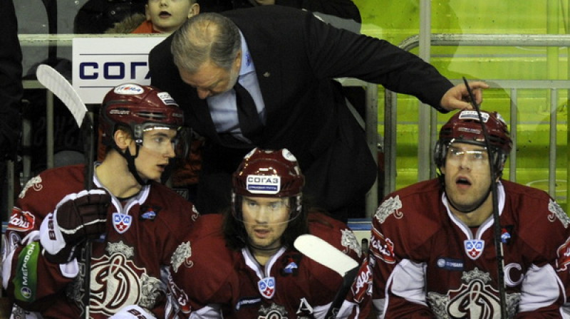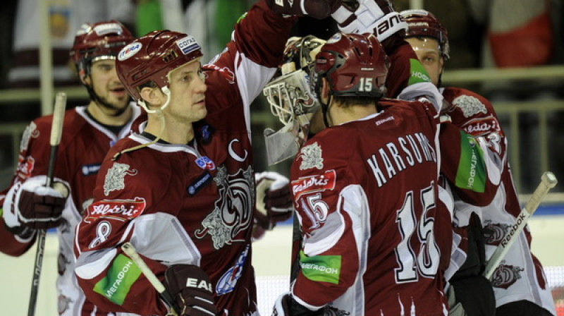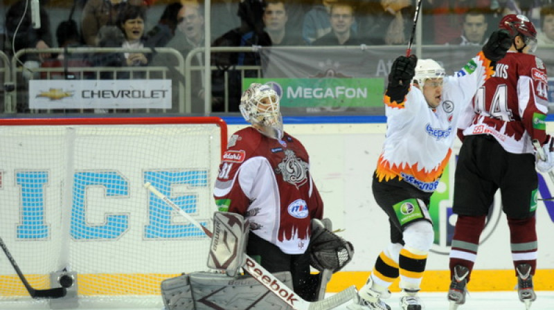 Pirmo uzvaru 2012. gadā izcīnīja Rīgas "Dinamo", kas Kontinentālās hokeja līgas regulārās sezonas spēlē ar 1:0 pieveica Oļega Znaroka un Harija Vītoliņa trenēto Maskavas "Dynamo". Foto: Romāns Kokšarovs, Sporta Avīze/F64.