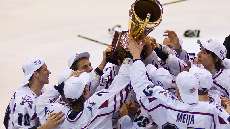Par Latvijas Atklātā čempionāta hokejā uzvarētājiem kļuvuši Rīgas ''Dinamo/Juniors'' hokejisti, Liepājā ar 3:2 uzvarot ''Liepājas Metalurgu''.Foto: Aigars Prūsis
