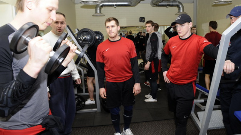 Tieši mēnesi pirms pasaules hokeja čempionāta atklāšanas, 7. aprīlī Latvijas valstsvienība hokejā pulcējas uz pirmo treniņu. „Inbox.lv” ledus hallē izlases kandidāti aizvadīja fiziskās sagatavotības treniņu. Foto: Romāns Kokšarovs, Sporta Avīze/F64.