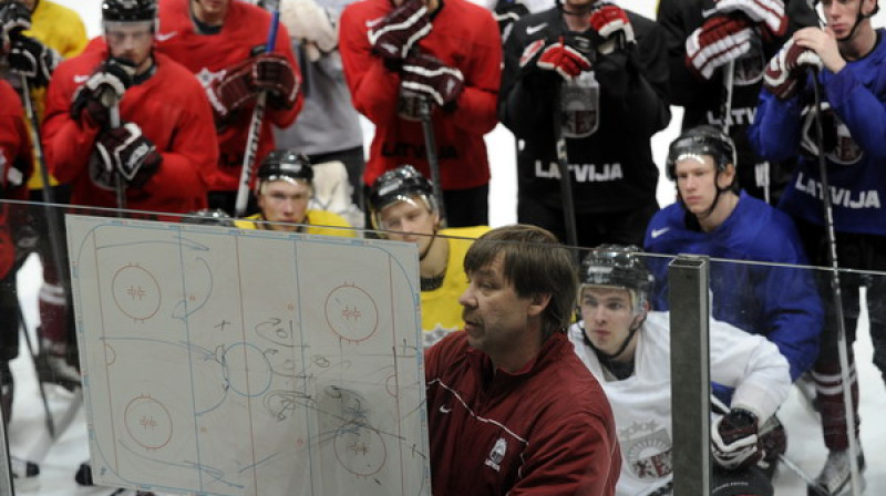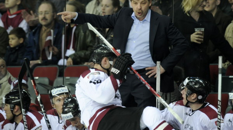 Treneri Oļegs Znaroks un Harijs Vītoliņš uz vienu dienu iegriezās Latvijā, lai novadītu pirmo Latvijas izlases ledus treniņu. Foto: Romāns Kokšarovs, Sporta Avīze/F64.