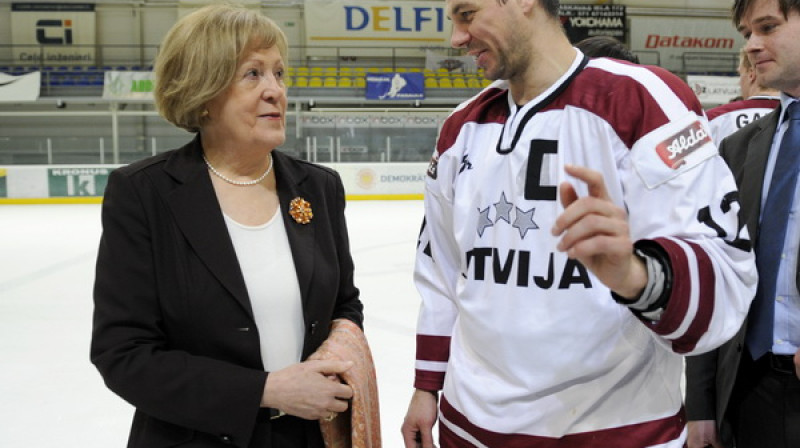 Turpinot gatavoties pasaules čempionātam, kas 7. maijā sāksies Vācijā, Latvijas hokejisti šodien pēc treniņa tikās ar Vācijas lietvedi Margitu Hēberli.Foto: Romāns Kokšarovs, Sporta Avīze/F64.