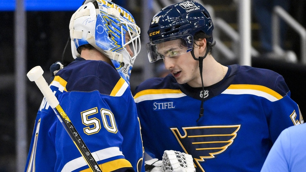"Blues" atspēlēšanos ievadīja 2023. gada drafta desmitā numura slovāka Dalibora Dvorska pirmie gūtie vārti līgā mača 37.minūtē. 20 gadus vecais Dvorskis NHL debitēja pagājušajā sezonā ar divām spēlēm, bet šī bija viņa piektā spēle pasaules spēcīgākajā līgā.
