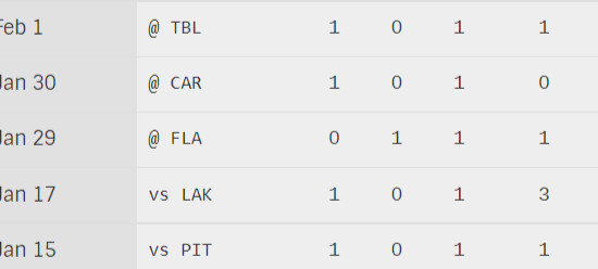 | Zemgus Girgensons | Sabres | 4 | 1+0 | 1 | 5 | +2 | 2 | 0+0 |