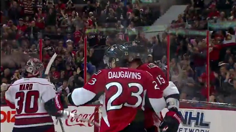 Kaspars Daugaviņš kārtējā NHL spēlē izdarīja elegantu piespēli savam komandas biedram Zakam Smitam, kurš guva vārtus pret Karolīnas "Huricanes".