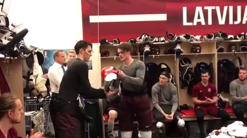 Latvijas hokeja izlases izbrucējs Rūdolfs Balcers noteica labāko spēlētāju mačā pret Dienvidkoreju un ugunsdzēsēja ķiveri pasniedza vārtsargam Elvijam Merzļikinam, kurš savu cietoksni nosargāja neieņemtu.Video: Latvijas Hokeja federācija
