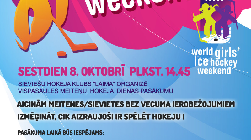 Sestdien, 8. oktobrī plkst. 14.45 “Mogo” ledus hallē Rīgā, Brīvības ielā 333 sieviešu hokeja klubs “Laima” organizē IIHF Vispasaules meiteņu hokeja dienas pasākumu.