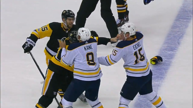 Aizvadītajā naktī Nacionālās hokeja līgas klubs Bufalo "Sabres" izlaida pārsvaru un izbraukumā ar 4:5 pagarinājumā atzina pēdējo divu gadu čempiones Pitsburgas "Penguins" pārākumu. Mača laikā izkauties bija gatava "Sabres" lielākā zvaigzne uzbrucējs Džeks Aikels, kurš pretiniekam metās virsū pēc spēka paņēmiena pret Semu Reinhārtu. Tomēr dūru cīņu izjauca Evandera Keina iejaukšanās.