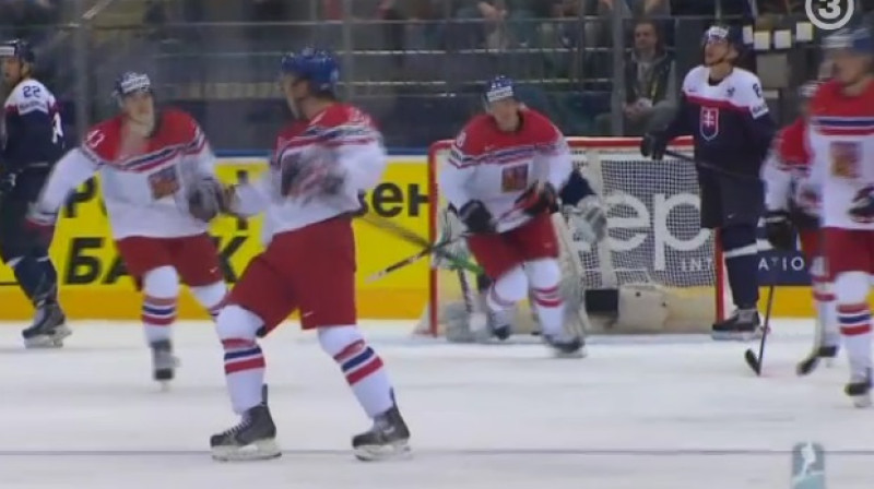Pirmajā pasaules čempionāta spēlē Čehijas hokeja izlase ar rezultātu 3:2 apspēlēja principiālo pretinieci Slovākiju.Video: TVPlay