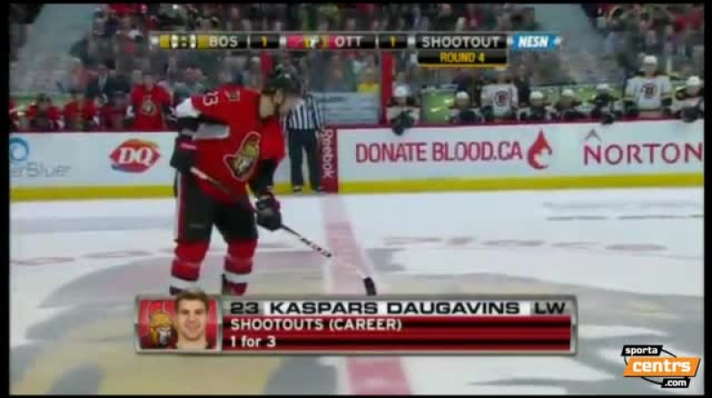 Šonakt zaudējumu Nacionālās hokeja līgas (NHL) spēlē piedzīvoja Kaspara Daugaviņa pārstāvētā Otavas "Senators" vienība, kas pēcspēles metienos atzina Bostonas "Bruins" pārākumu ar 2:3. Daugaviņam neizdevās realizēt savu pēcspēles metienu.