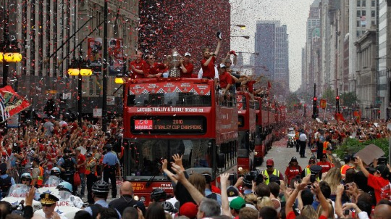 Kā jau zināms, naktī no trešdienas uz ceturtdienu pēc Latvijas laika, tai pus okeānam tika noskaidrota spēcīgākā hokeja komanda Nacionālajā hokeja līgā (NHL), proti, Stenlija kausu ieguva Čikāgas "Blackhawks" hokejisti! Šodien par godu šim notikumam, Čikāgā tika sarīkota parāde, kurā simboliski tika atrādīts Stenlija kauss. Pasākums pulcējā ievērojamu skaitu publikas!